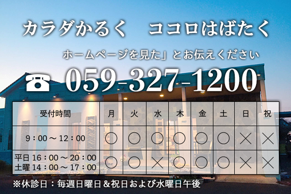 苦痛を和らげる「手」の治療、最新の医療機器、分かりやすい説明で、地元四日市のみなさまに愛されながら、人々の健康を祈り日々治療を行っております。